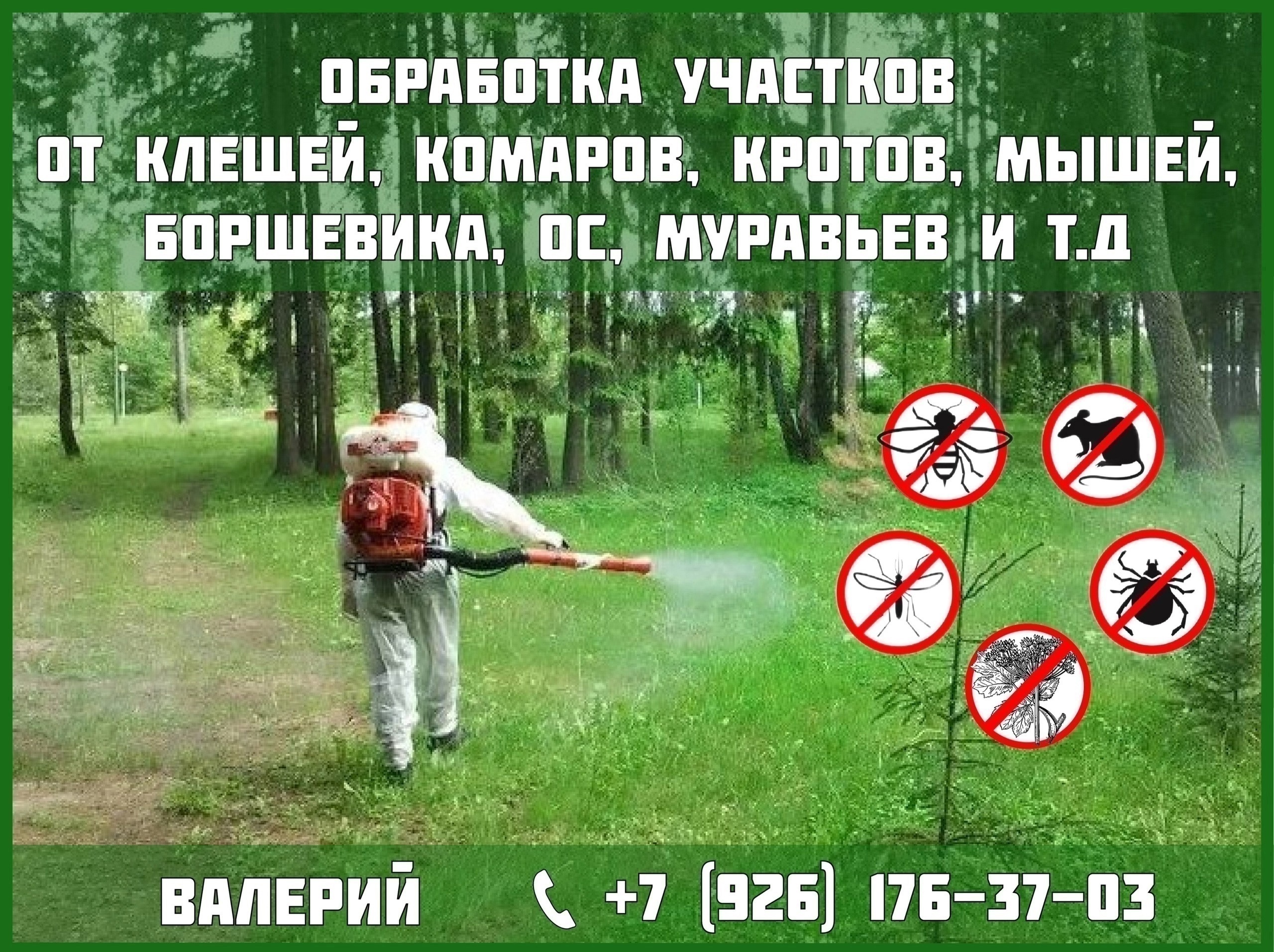 Здравствуйте, меня зовут Валерий, и я предоставляю услуги по дезинсекции. Помогу вам решить проблемы с: кротами, клещами, комарами, клопами, тараканами, короедом, осами, шершнями, тлей, муравьями, мышами, крысами, сорняками, плесенью, неприятными запахами и др.